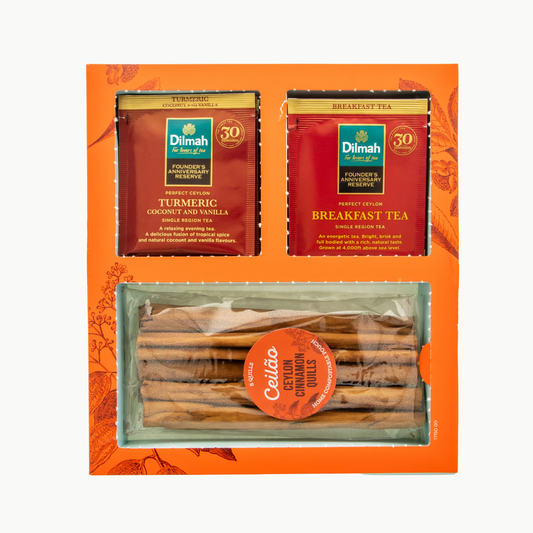 A taste of Sri Lanka. Our Perfect Ceylon Breakfast Tea and exotic Turmeric, Coconut and Vanilla with Ceylon Tea in an indulgent gift selection with quills of our luxurious, artisanal Ceylon Cinnamon.